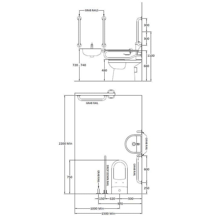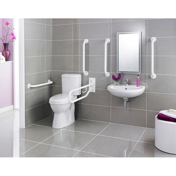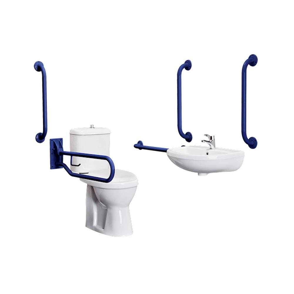 - Includes; Comfort Height Doc M Pan, Doc M Cistern, Toilet Seat,Wall Mounted Basin, 5 Grab Rails (5th rail to be fitted to the backof the door), 1 Drop-down Rail & Spray Mixer Tap