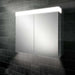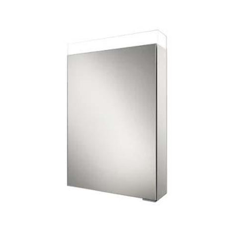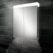Single door bathroom cabinet with LED illumination, ambient under cabinet lighting and mirrored sides.