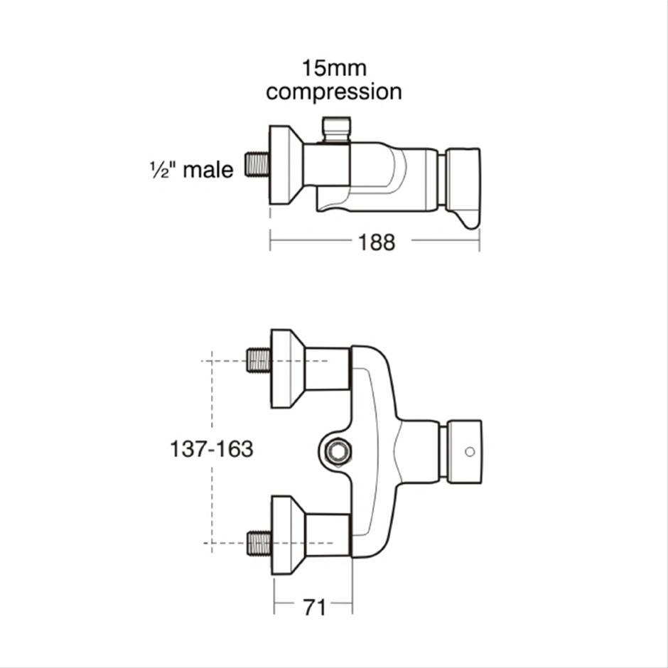 A variable temperature control, exposed self closing shower mixer with push button which is water saving and anti vandal. Adjustable time delay for automatic shut off with non-concussive action to avoid water hammer. Designed to be supplied with pre-mixed water via a thermostatic blending valve.