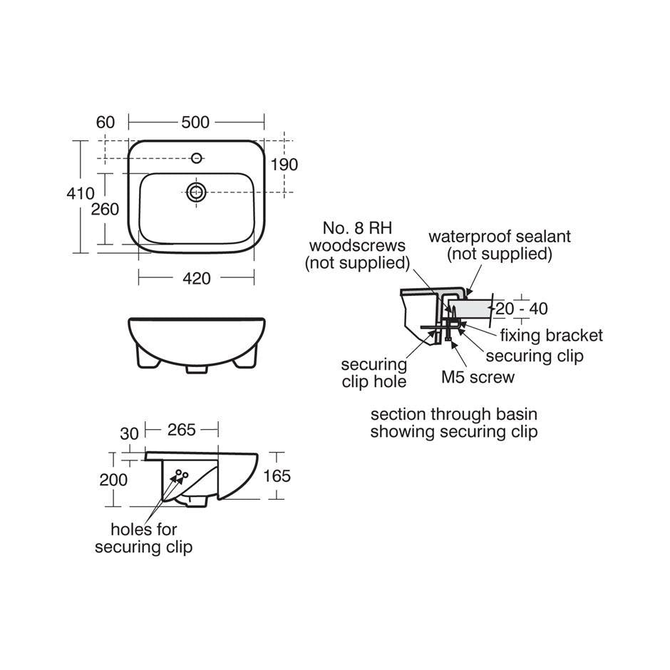 Washbasin fixed to countertop with securing clips provided. Joint sealed with waterproof sealant (not supplied)