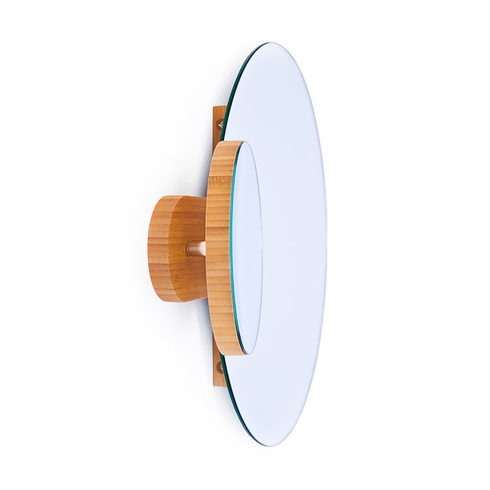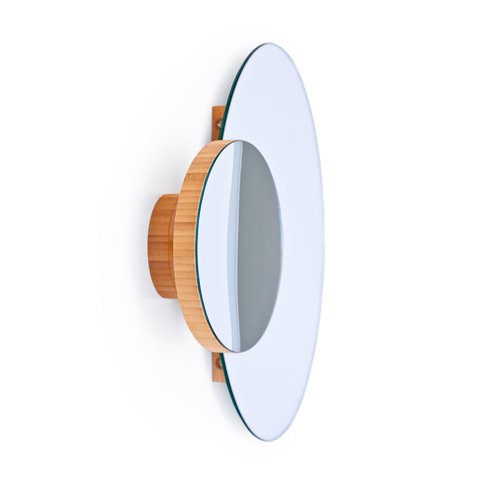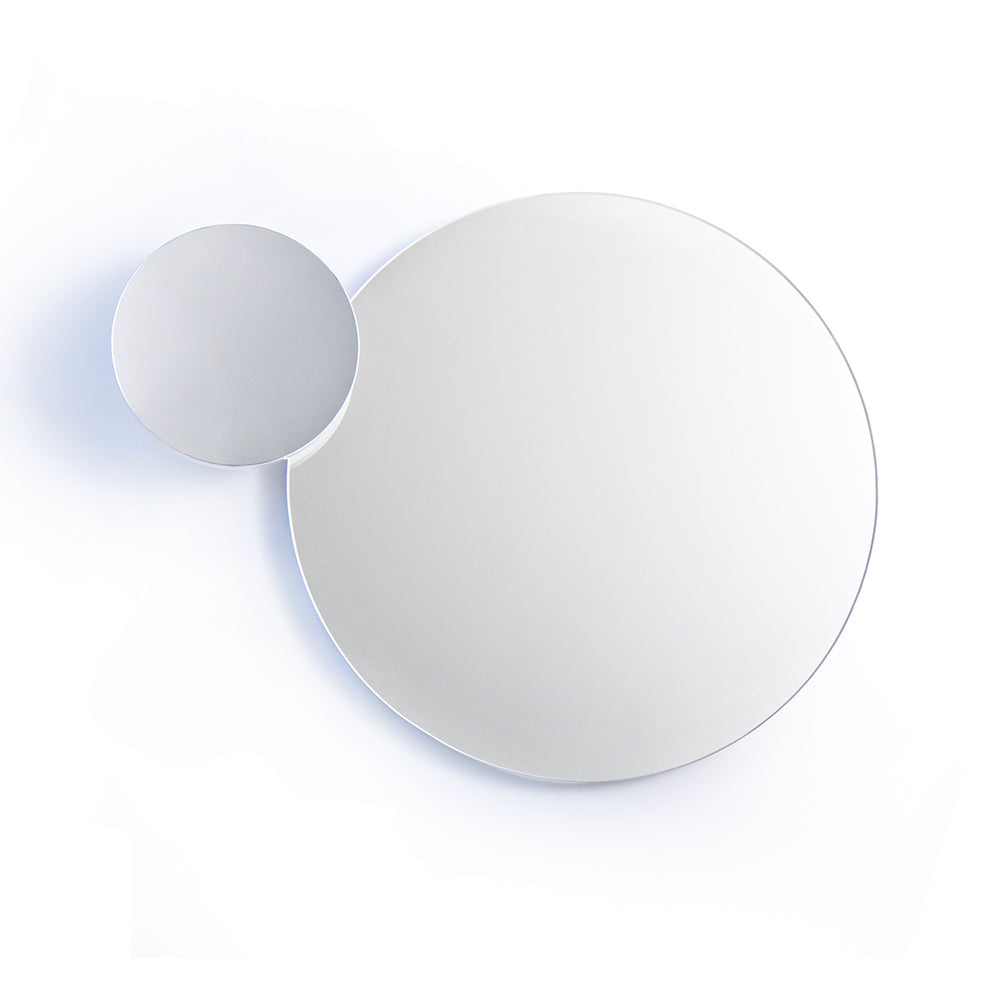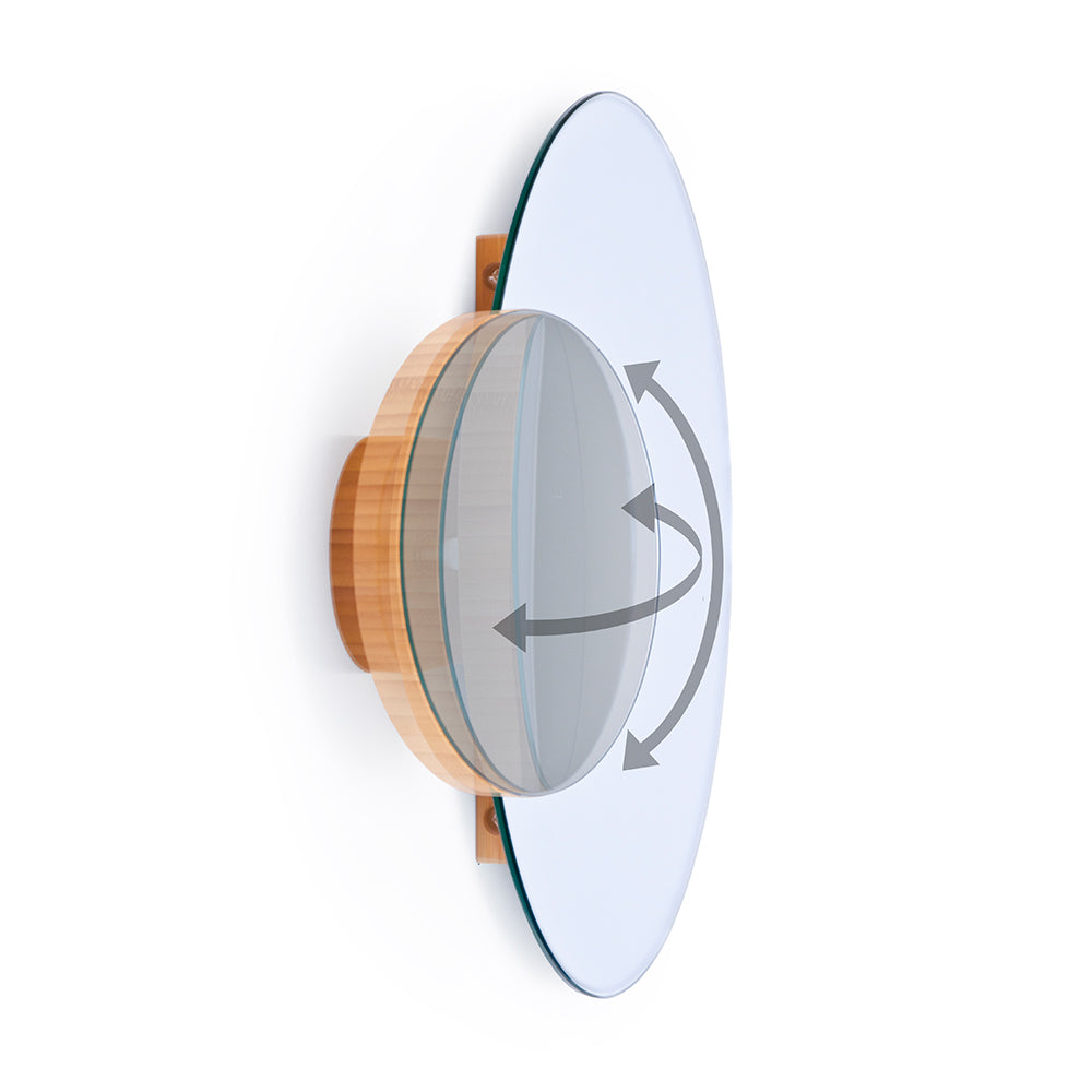 The Eclipse is a partnership, a full wall mirror and five times magnification vanity mirror in one. The magnifier is fixed to an articulated, bespoke engineered stainless steel joint.