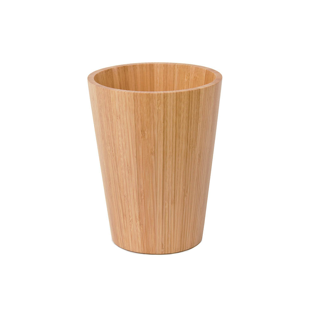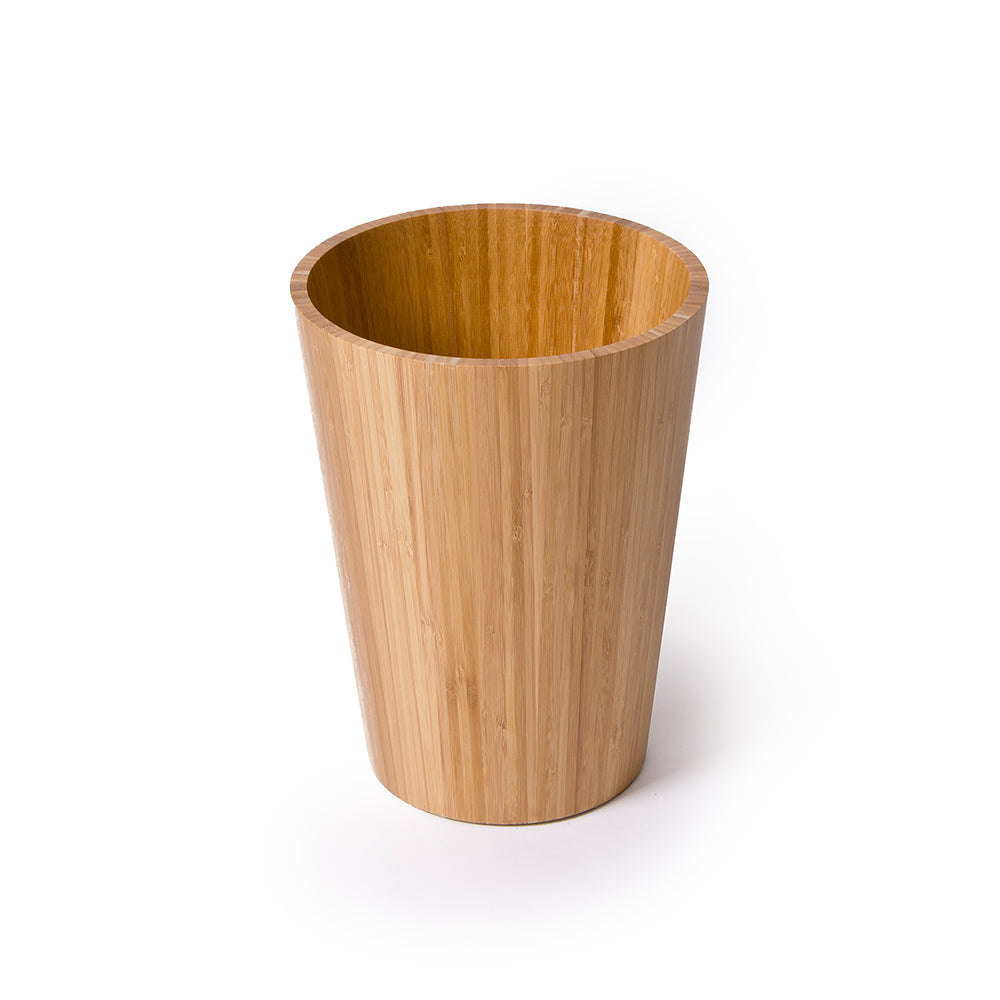Individually assembled by hand, thin strips of bamboo are laminated together to form of this conical shape. A squared top and bottom edge is cut to achieve a contemporary look.
