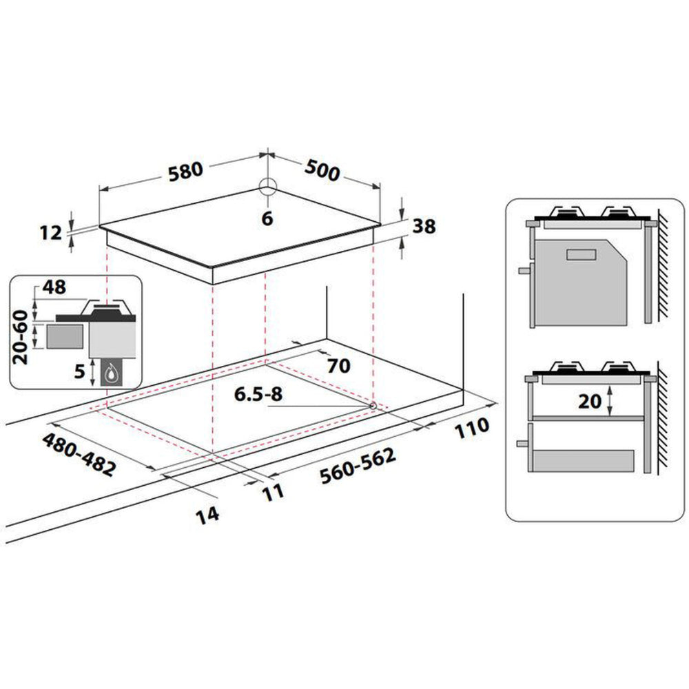 - Cut-out dimensions (mm): W 560-562 x D 480-482