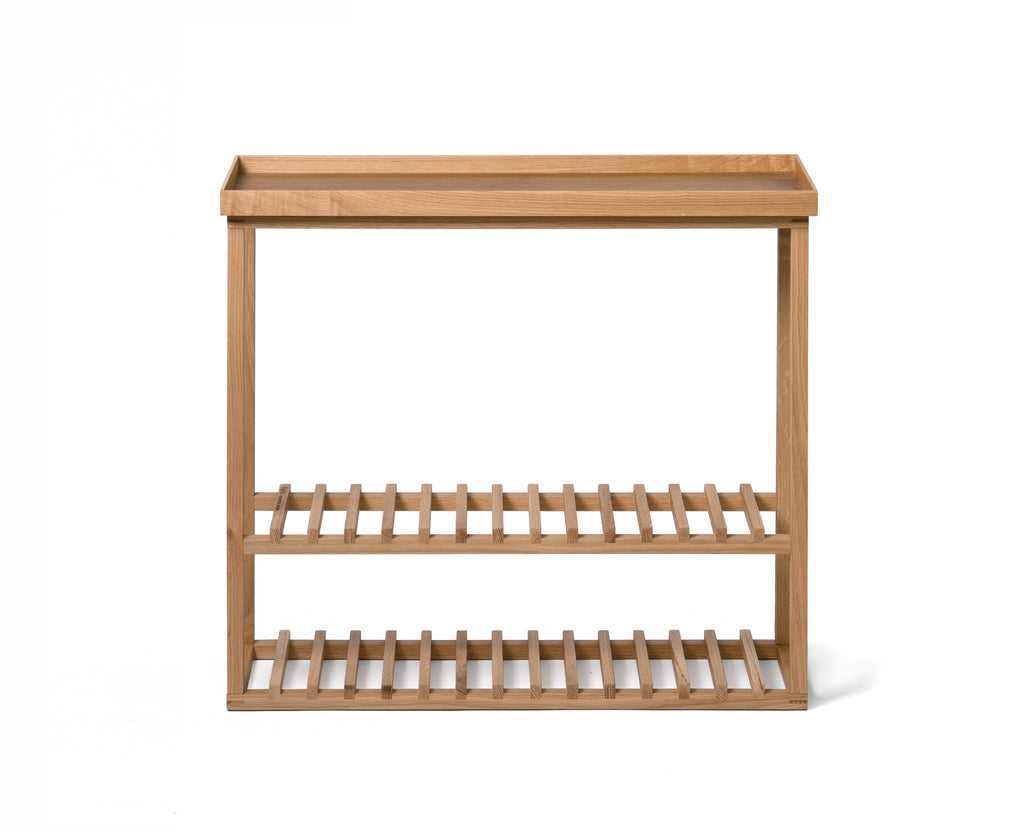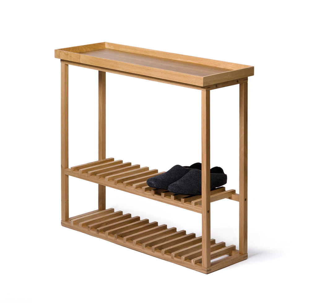 The Hello Storage Table's slim profile means that it can easily be pushed flush against a wall, without blocking walking space. It has shelving space for footwear and a top surface for keys, mail, gloves or lists.