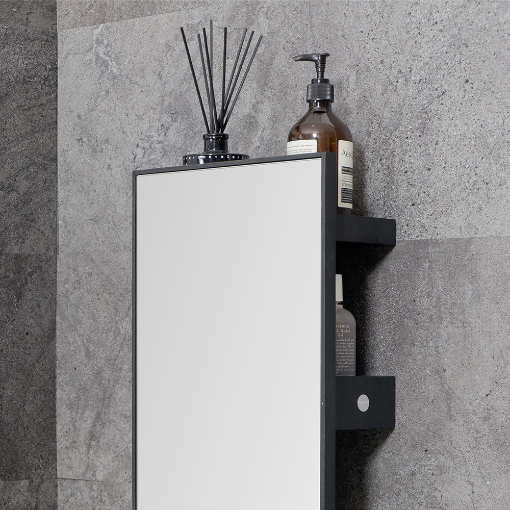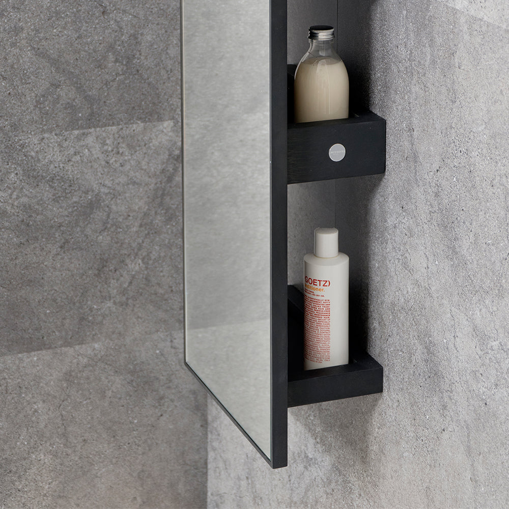 The Slimline 3 Tray Mirror is made from sustainably harvested, dark stained American white oak and oak veneers, selected for their depth of colour, beautiful grain pattern and traditional hardwood durability. All edges look crisp but are carefully hand sanded to make them soft to the touch. Finished with a matt, water resistant lacquer. Simple keyhole installation with hidden fixings gives a seamless look.