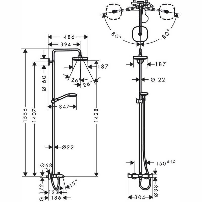 - Consists of: overhead shower, hand shower, thermostatic bath mixer, shower hose, slider