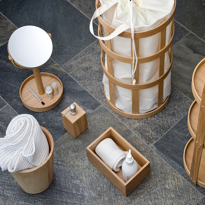 Made from sustainably harvested, solid American white oak, and oak veneers, finished with a matt, water resistant lacquer. All edges look crisp but are finely hand sanded to make them soft to the touch. Silicone rubber feet stop it slipping. Bag is washable.
