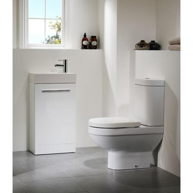 The compact nature of this super sleek 450mm unit makes it an ideal solution for smaller bathrooms, cloakrooms or en suites. The clean lines of the ceramic basin perfectly complement the Kobe furniture and the 1 tap hole is offset to the right hand side for a contemporary look. Complete the look with the Kobe WC back to wall units for a fully coordinated feel.