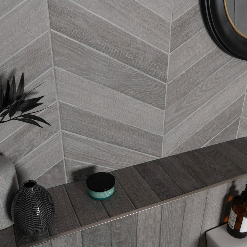 These Ancona Chevron Chocolate Tiles have a stylish wood effect design across 35 face variations in a matt finish. They're made from porcelain and measure 80x400x8.5mm.