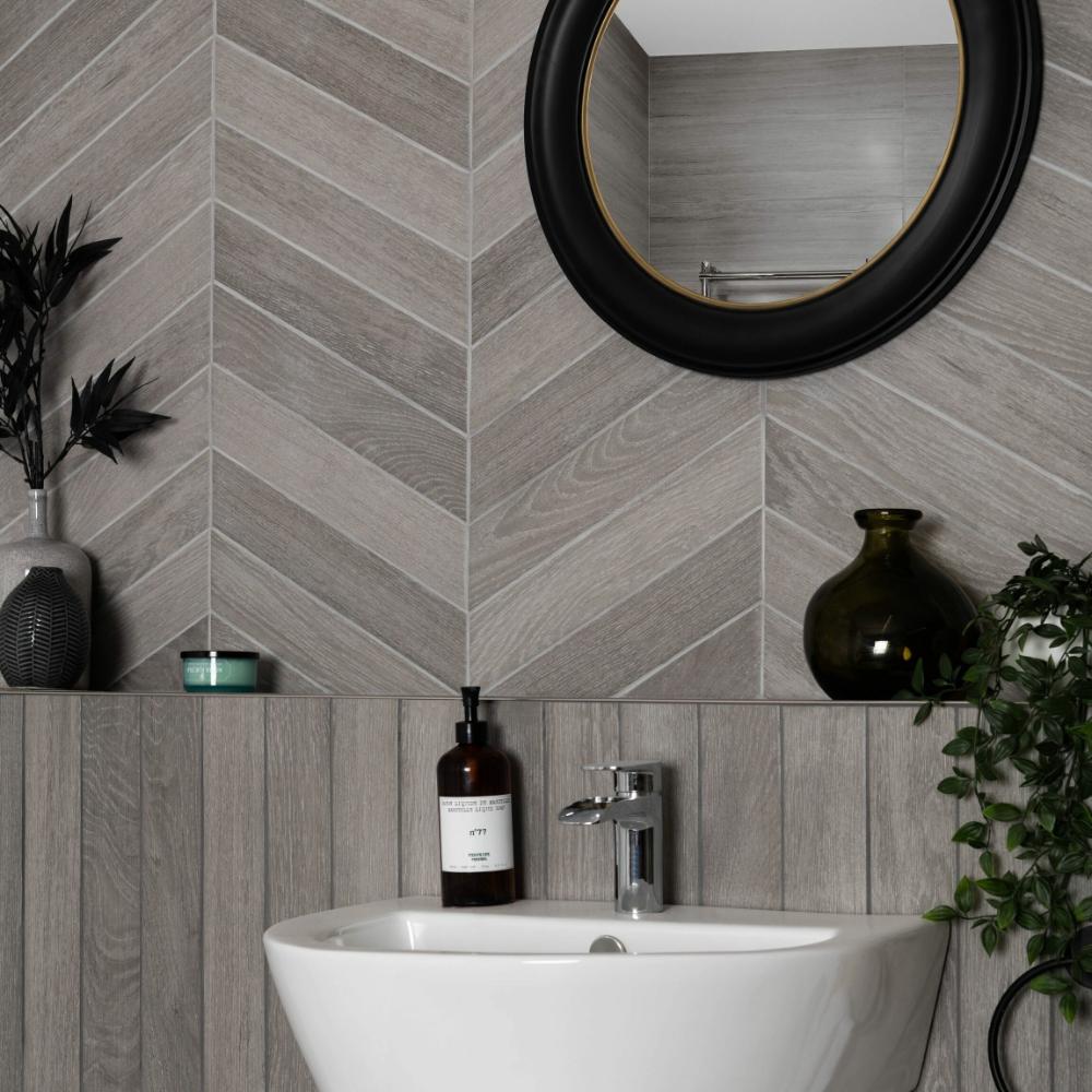 Click for BONSAI CHEVRON SMOKY WOOD EFFECT TILES LAYOUT EXAMPLES - 801601