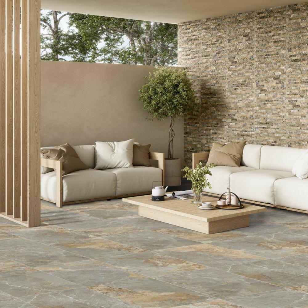 The Strato Natural Grey Slate Effect Outdoor Slab, featuring a natural grey finish and a riven surface texture, brings a rustic charm to exterior floor designs. With its versatile 600x900mm format with 20mm slab thickness, rectified edges, and 11 face variations, this multi-tonal tile offers a uniquely textured and versatile design solution.