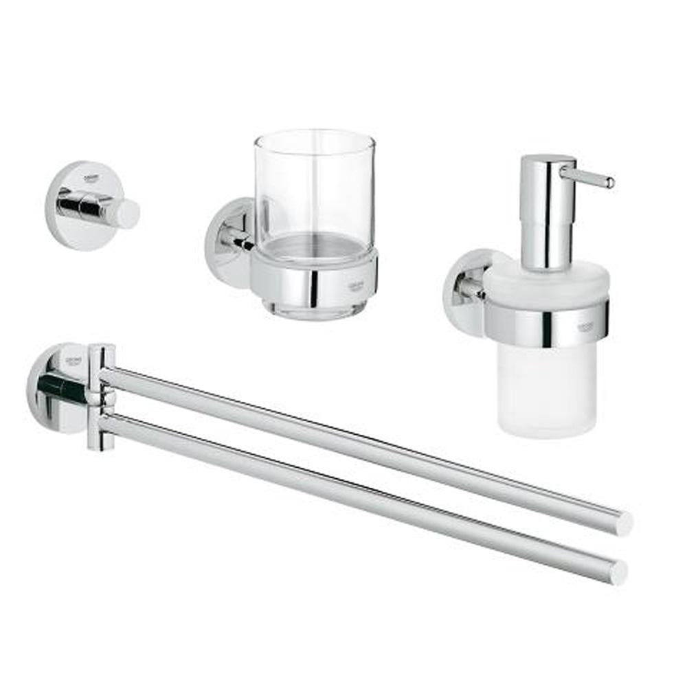 Grohe Essentials 4-in-1 Chrome Bathroom Accessories Set - Robe Hook, Towel Bar, Tumbler Glass & Soap Dispenser