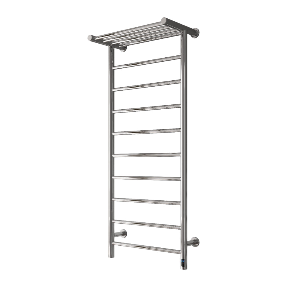 The Maira Dry Electric Heated Towel Rail, crafted from premium stainless steel, features an integrated towel shelf, concealed wiring, and a discreet bottom-right control panel. With dry electric technology and a timer function offering 2, 4, and 24-hour settings, it delivers excellent heat output and sleek, efficient functionality.