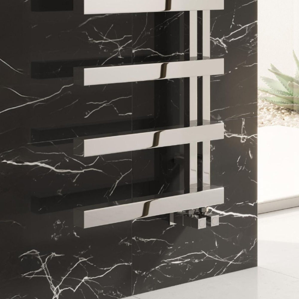 The Piazza Towel Radiator boasts a stylish, contemporary offset ladder design featuring horizontal square bars, constructed from high-quality stainless steel with a glossy finish. Its reversible design allows for versatile installation options, while its remarkable heat output and a 25-year warranty ensure both effectiveness and longevity in any environment.