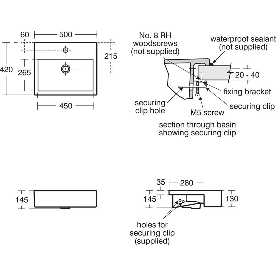 Washbasin fixed to countertop with securing clips provided. Joint sealed with waterproof sealant. (not supplied)
