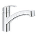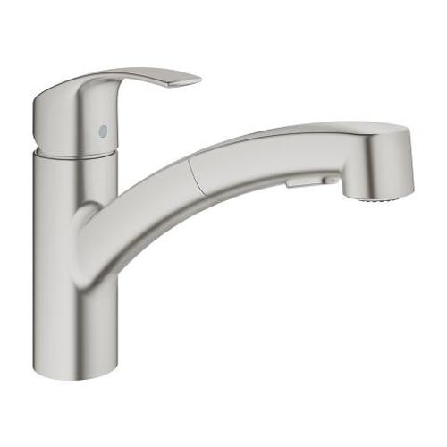 Keep it simple but stylish - and get all the user-friendly features and pure craftsmanship you expect - with the GROHE Eurosmart pull-out single-lever sink mixer. From the speedy fitting with our Easy Installation System onwards, this affordable kitchen tap takes the hassle out of kitchen chores. A busy kitchen requires total flexibility, so for extra convenience in tight spaces this Eurosmart kitchen mixer features a limited turn of 90°, plus a comfort shower head with two spray options thats perfect for filling pots and pans or powerful sink cleaning. The GROHE EasyDock system also means that the shower head retracts easily and neatly when youre done, and SpeedClean silicon nozzles can be cleared of limescale with a brush of your finger. Inside GROHE SilkMove technology ensures life-long smooth and accurate water and temperature control, while GROHE Zero means your drinking water is lead and nickel-free. Plus the sparkling GROHE StarLight chrome finish is scratch-resistant for a dazzling surface that will last and last.