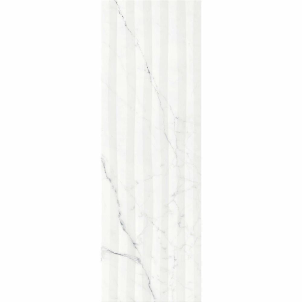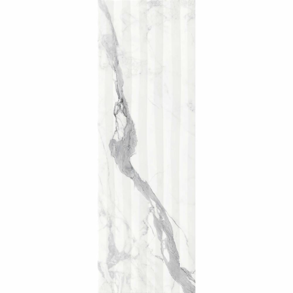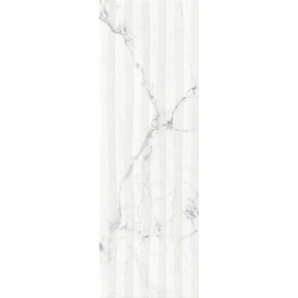 Meet Mistral, a veined marble-effect tile with a linear texture and grey accents. Its large 900x300mm white body ceramic format is perfect for interior walls.