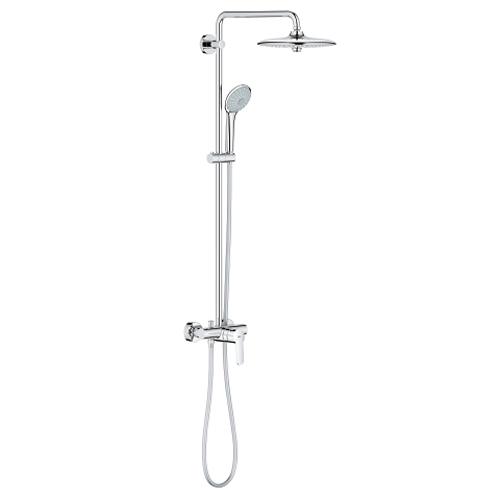 This impressive shower system with a single lever mixer adds instant designer style and showering enjoyment to any modern bathroom. Packed with GROHEs cutting edge technology, top performance is guaranteed. GROHE EcoJoy limits water flow to 9.5 l/min but guarantees complete showering satisfaction and GROHE DreamSpray ensures the flow of water from every nozzle is even. The 260mm head shower comes with three distinctive spray zones. Jet Spray is powerful and focused, perfect for washing out shampoo and an invigorating head or neck massage. The SmartRain Spray is wider for an energizing yet relaxing experience and Rain Spray uses all the nozzles on the generous spray plate for full body coverage and a truly soothing shower. To choose the spray you want all you have to do is turn the button in the centre of the spray head. And its 450mm arm even swivels through 180° for added flexibility. The 110mm hand shower, which has a Silverflex (1750mm) TwistFree hose, offers the soft Rain, the water-saving SmartRain and the powerful Massage Spray. GROHEs SilkMove cartridge ensures the precise control of water volume and temperature. The handy silicon SpeedClean nozzles means it is easy to keep free of dirt and limescale! The scratch resistant GROHE StarLight chrome has a sparkle that lasts for years and the Inner WaterGuide prevents the surface of the shower from getting hot. The GROHE Euphoria 260 shower system - all-round showering perfection!