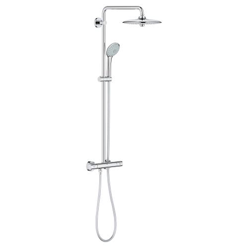 The impressive water saving GROHE Euphoria 260 shower system with thermostat adds instant designer style and showering enjoyment to any modern bathroom. Packed with GROHEs cutting edge technology, top performance is guaranteed. Set your desired temperature with GROHE TurboStat and the water will stay just how you like it even if the supply fluctuates. The easy-to-use GROHE SafeStop feature limits the water temperature to a maximum of 38°C - great for giving children independence in the bathroom - but can be raised for adults. The AquaDimmer lets you effortlessly control the volume of water while also directing the flow of water between the head and hand shower, which has a 1750mm TwistFree hose. GROHE EcoJoy limits water flow to 9.5 l/min but guarantees complete showering satisfaction and GROHE DreamSpray ensures the flow of water from every nozzle is even. The 260mm head shower comes with three distinctive spray zones. Jet Spray is powerful and focused, perfect for washing out shampoo and an invigorating head or neck massage.The SmartRain Spray is wider for an energizing yet relaxing experience and Rain Spray uses all the nozzles on the generous spray plate for full body coverage and a truly soothing shower. To choose the spray you want all you have to do is turn the button in the centre of the spray head. And the 450mm shower arm even swivels through 180° for added flexibility. The 110mm hand shower also has three sprays: the soft Rain, the water-saving SmartRain and the powerful Massage Spray. The handy silicon SpeedClean nozzles means the showers are easy to keep free of dirt and limescale! The multilayered coating of scratch resistant GROHE StarLight chrome has a sparkle that lasts for years and the Inner WaterGuide prevents the surface of the shower from getting hot. The GROHE Euphoria 260 shower system - all-round showering perfection!