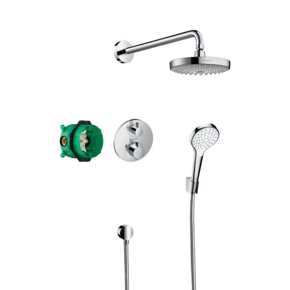 - Consists of: overhead shower, hand shower, thermostatic shower mixer, basic set, shower arm, shower holder, wall outlet, shower hose