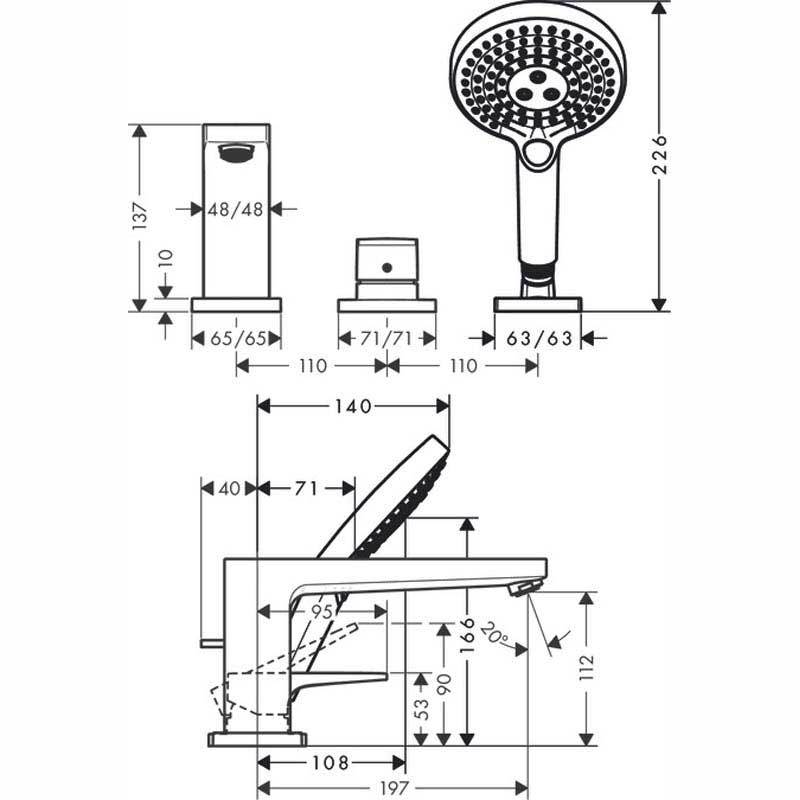 - Consists of: 3-hole rim-mounted single lever bath mixer, hand shower, shower holder