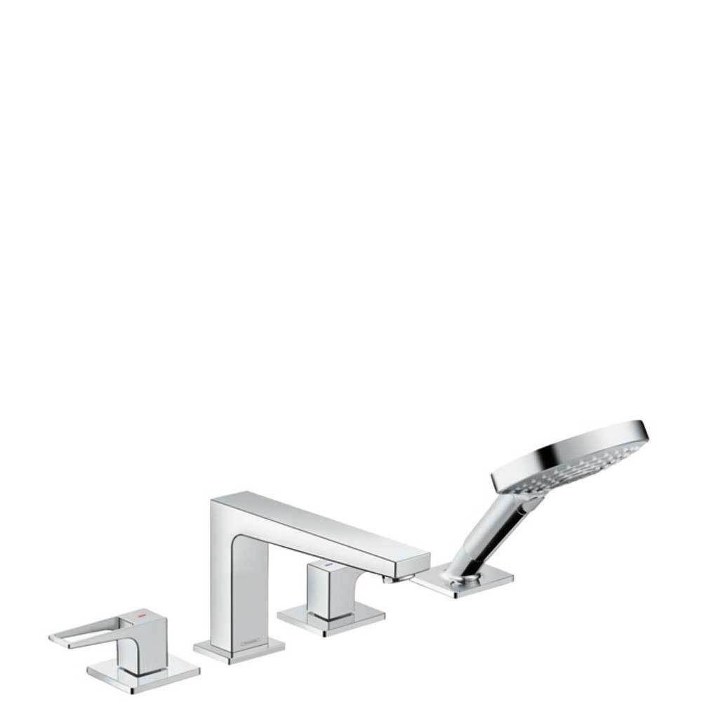 - Consists of: 4-hole rim-mounted bath mixer, hand shower, shower holder