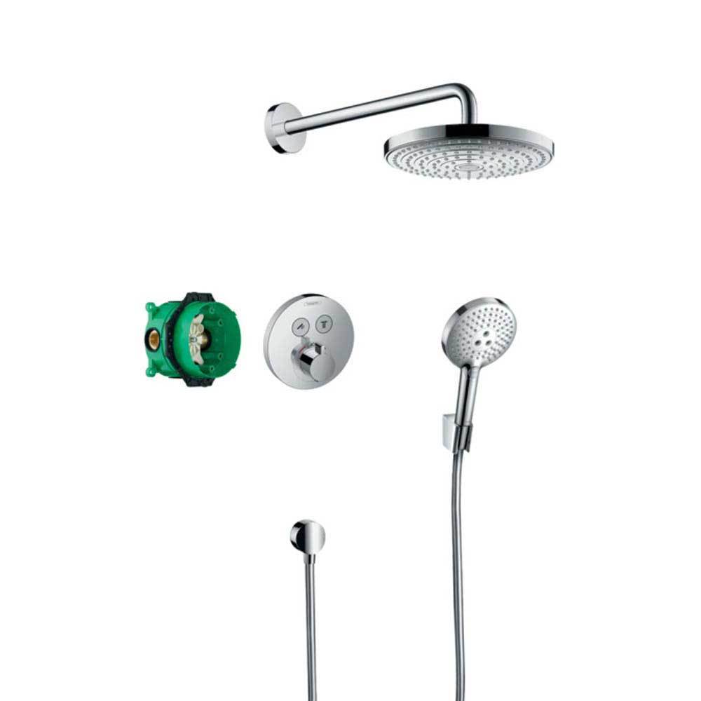 - Consists of: overhead shower, hand shower, thermostatic shower mixer, basic set, shower arm, shower holder, wall outlet, shower hose