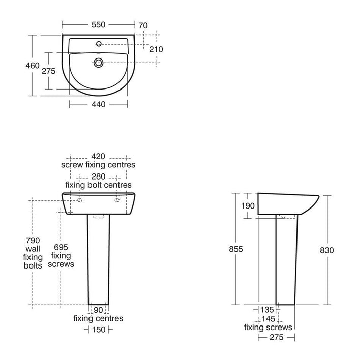 Washbasin wall mounted using E0157 wall fixing set or full pedestal mounted using 2 screws through back of basin (not supplied).