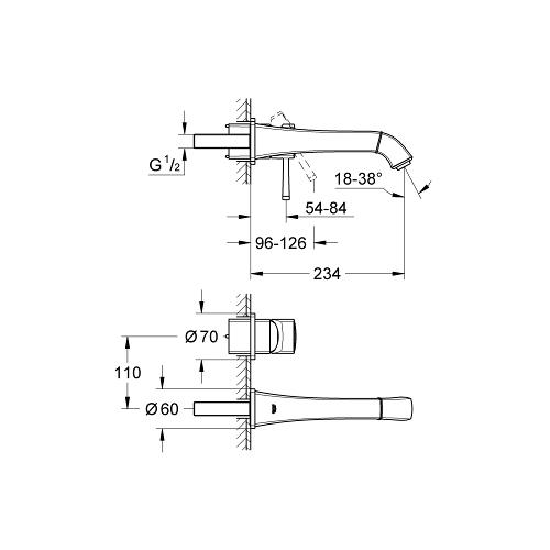 This wall-mounted tap in our elegant Grandera design can be operated comfortably with one hand. Setting the variable GROHE AquaGuide aerator at the desired angle, you can adjust its water flow to the shape and depth of your basin. With the durable GROHE StarLight chrome finish, the tap is particularly easy to clean and will always look shiny and new, even after years of use. Thanks to the integrated GROHE EcoJoy water-saving technology, your water consumption will be reduced by up to 50%, even at full volume. With its bold, expressive shapes, this extravagant tap will make a stunning addition to your bathroom. This wall-mounted single-lever tap can only be installed in combination with the GROHE 23319000 concealed body.