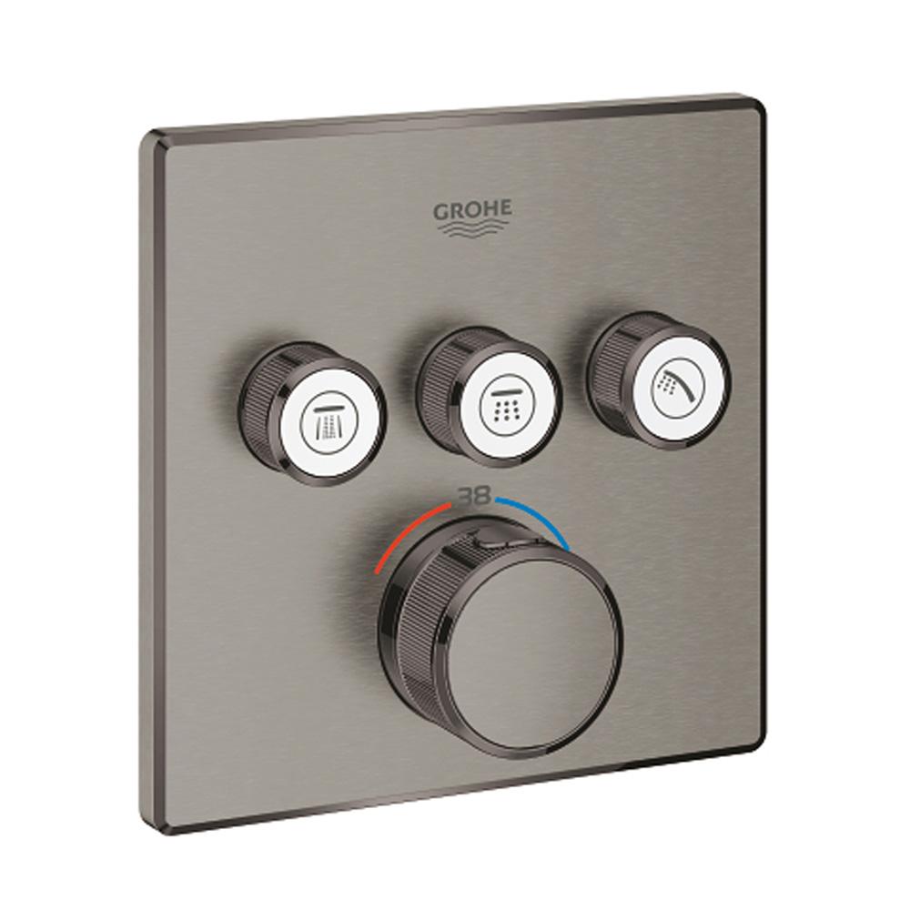 If you're looking to enhance your modern, minimalist bathroom look without compromising on usability and performance, then fit a thermostat that takes both to the next level. Packed with useful features, the Grohtherm Smart Control concealed thermostat's innovative technology allows you to select your desired spray source and adjust the water volume at the push-turn of a button. The three valves offer total flexibility, whatever your shower set up - you can control, switch between or even combine different spray patterns and water outlets - perfect for spaces where you want to have hand, head and side showers, as well as a bath. Integrated Grohe TurboStat technology prevents any unpleasant temperature fluctuations. Grohe EasyLogic markings and textured buttons with exchangeable symbols make it easy and intuitive to use. Family-friendly, the Grohe SafeStop override button allows you to set a maximum temperature of 38° C to prevent scalding - the Grohe SafeStop Plus optional temperature limiter lets you add a further limit of 43° C for an extra level of safety. Water-saving Grohe EcoJoy technology gives you the option of a reduced flow rate with no compromise on enjoyment. Thanks to the Grohe Quick Fix System it's swift and straightforward to install. The slim profile makes it easy to keep clean, and the hardwearing Grohe Star Light finish will maintain its flawless looks using physical vapour deposition (PVD) for an extra level of scratch-resistance. with a slim, square design perfect for that minimalist, streamlined look, this product is bound to enhance your bathroom scheme. Please note that this product must be installed in combination with the Grohe Rapido Smart Box (35600000).