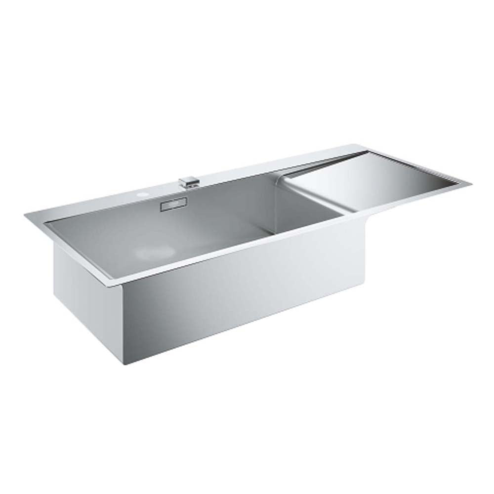 Make the sink the focal point of your kitchen with a sink engineered for quality, style and performance. The GROHE K1000 stainless steel sink with drainer – designed to be flush-mounted for a sleek look or mounted on the worktop and made to be fitted with the sink on the right – features sharp angles and a stylish diamond base to the sink. The bowl depth of 20cm gives this sink has a generous capacity, comfortably fitting large pans. The automatic waste fitting with remote control means you can pull the plug without having to put your hand in the dirty water, and GROHE Whisper insulation on the underside to reduce noise. The sink is made from GROHE Starlight AISI 304 grade stainless steel, with a brushed finish to make the surface less porous and easier to keep clean, meaning it will look good for longer.