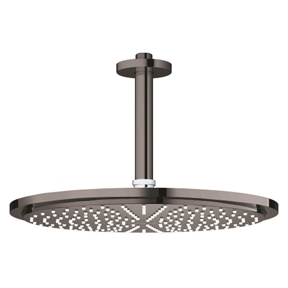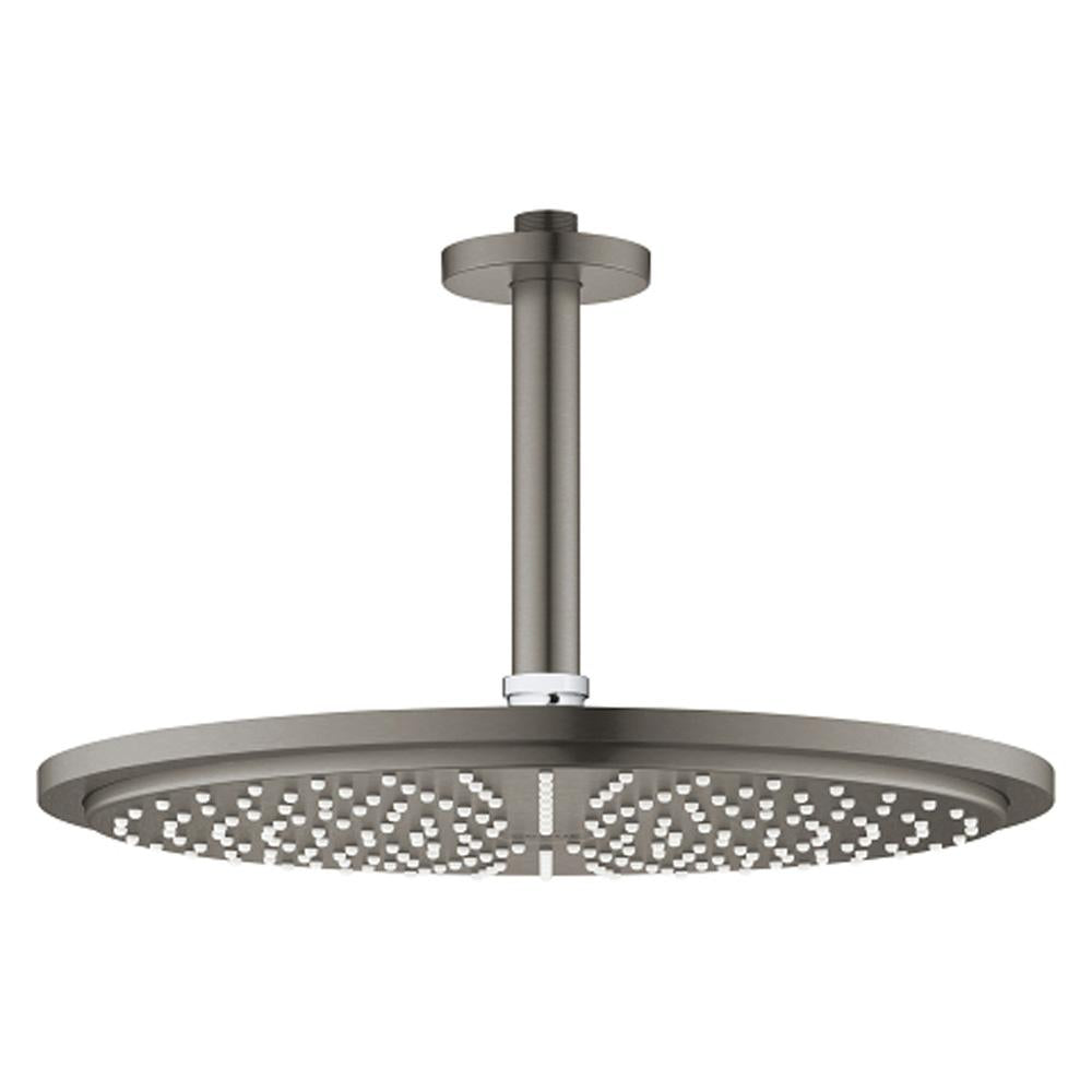 The generous ceiling-mounted Grohe Rain shower Cosmopolitan 310 Head shower set in Brushed Hard Graphite with 142mm shower arm adds instant designer style and premium performance to any bathroom. The System is also packed with Grohe's cutting edge technology. Grohe DreamSpray ensures the flow of water from every nozzle is even - the perfect way to enjoy the PureRain spray with its large and soft drops. Like summer rain! And Grohe EcoJoy cuts water usage but guarantees complete showering satisfaction. The handy silicone Speed Clean nozzles are easy to keep free of dirt and lime scale and the Inner Water Guide prevents the surface of the shower from getting hot as well as protecting the scratch resistant and easy-to-clean Grohe Star Light surface for excellent durability.