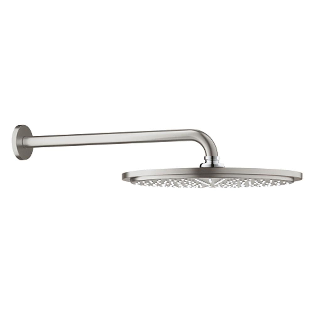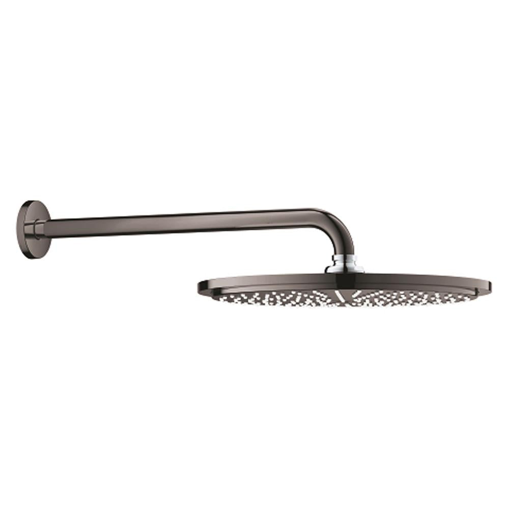 The generous wall-mounted Grohe Rain shower Cosmopolitan 310 Head shower set in Brushed Hard Graphite with 380mm arm adds instant designer style and premium performance to any bathroom. The System is also packed with Grohe's cutting edge technology. Grohe DreamSpray ensures the flow of water from every nozzle is even - perfect for enjoying the shower's soft PureRain Spray - while Grohe EcoJoy cuts water usage but guarantees complete showering satisfaction. DropStop is a great function that prevents any drips from the head shower once it is horizontal and the valve is closed. The handy silicone Speed Clean nozzles are easy to keep free of dirt and lime scale. And the Inner Water Guide prevents the surface of the shower from getting hot as well as protecting the scratch resistant and easy-to-clean Grohe Star Light surface for excellent durability.