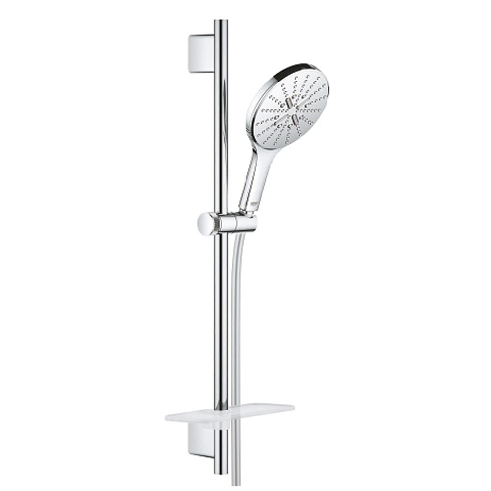 Why not give your shower an instant upgrade with the sleek and stylish GROHE Rain shower 150 Smart Active hand shower with a generous shower head of 150mm diameter. Made in Germany, it comes with a TwistFree Silve rFlex shower hose (1750mm), matching rail (600mm) and a GROHE EasyReach tray to organize your shower space. It is also packed with innovative technology. GROHE SmartTip - an ergonomic controller on the rear of the handle - gives you fingertip control of the spray pattern: pulsating GROHE ActiveMassage spray, which delivers a whole new level of revitalising massage power, invigorating Jet Spray and Rain Spray - as gentle as warm summer rain. When you turn the water off GROHE DripStop minimizes annoying drips from Rain and Jet spray. Thanks to GROHE DreamSpray, the flow from every nozzle has a perfectly balanced flow for maximum satisfaction, and the silicone anti-lime SpeedClean nozzles are extra easy to clean too. It also has GROHE EcoJoy, which limits water flow to 9.5 l/min but also delivers pure indulgence, and the scratch resistant GROHE Star Light chrome finish will sparkle brightly for years. And the Inner WaterGuide prevents the surface from getting too hot, protecting both your skin, and the chrome. Installation is incredibly easy: the GROHE Quick Fix Plus system ensures you can use existing holes while GROHE TileFix gives you the flexibility to alter the depth of each bracket to create a perfect fit, ideal for partially tiled bathrooms. With GROHE Rain shower 150 Smart Active shower rail set sleek modern design meets luxurious performance!