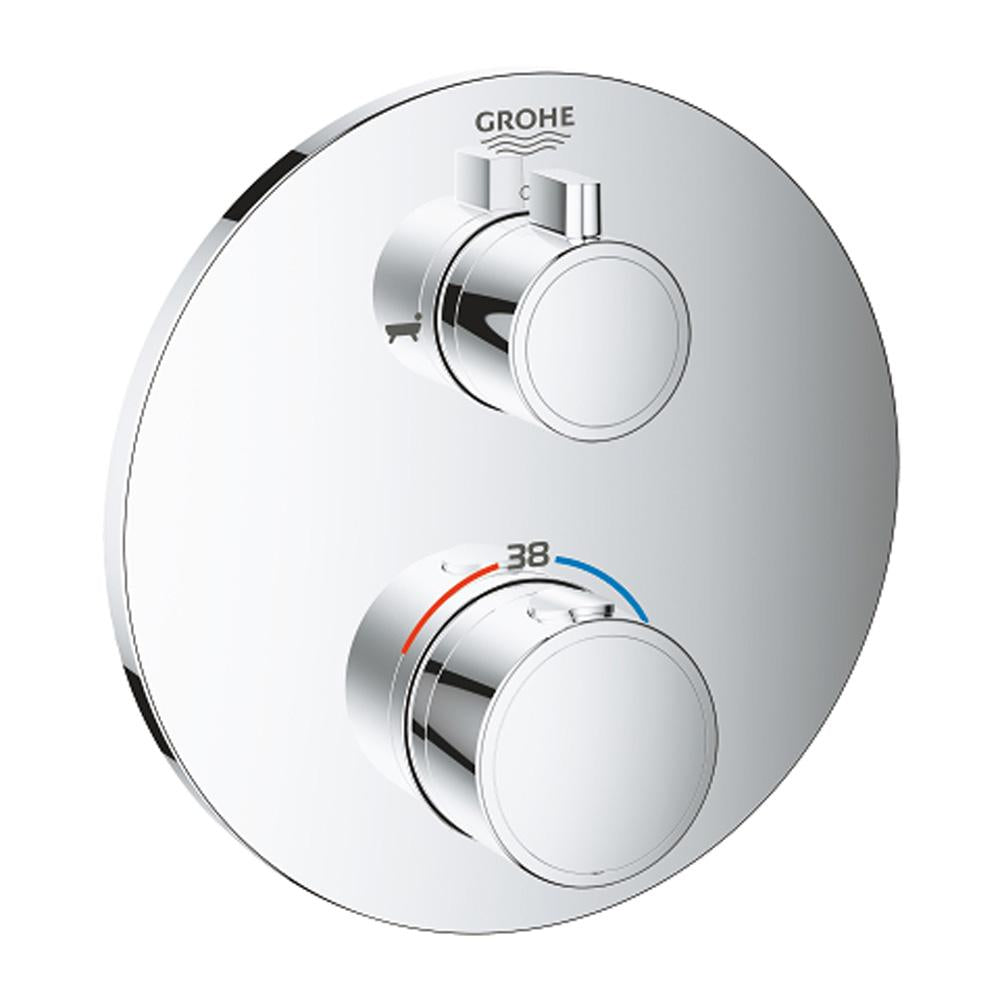The Grohtherm thermostatic bath mixer trim set provides the perfect final element for your bathtub, designed to allow you to switch effortlessly between shower and bath outlet. Control flow easily with GROHE AquaDimmer’s simple action that lets you effortlessly direct the water where you want while simultaneously setting the volume. The tactile design invites you to interact with the intuitive controls, and the round shape and slim profile (10mm wall plate, 43mm total projection) is ideal for minimalist schemes. This thermostat is made in Germany and packed with innovative technology! GROHE TurboStat technology prevents any unpleasant temperature fluctuations. It’s family-friendly too as the GROHE SafeStop override button is set at 38°C so scalding is a thing of the past. And the GROHE SafeStop Plus optional temperature limiter lets you add a further limit of 43° C for an extra level of safety. The hardwearing, lustrous GROHE Star Light chrome finish will look pristine for years to come. And the GROHE Quick Fix metal escutcheon with a locking system and covered sealing makes the installation swift and easy. Please note that this product must be installed in combination with the GROHE Rapido Smart Box (35600000). And you can be sure: This combined solution for concealed installation is 100% safe against leakage.