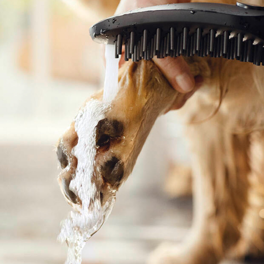 • Soft nozzle sprays massage and brush with water. The silicone brush-like sprays are easy to clean once you've washed your dog: The long nozzles are flexible and have a larger diameter than standard brushes. So you can simply rub off the remaining dirt and soap suds.