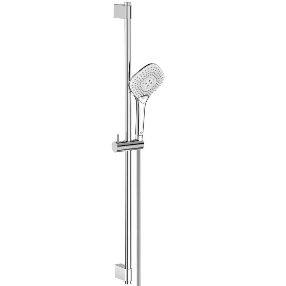 Kit includes 3 function contemporary diamond shaped ø125mm handspray, featuring 3 shower modes (including an invigorating Drop Jet) all selectable via a single push-button, variants with 600mm or 900mm slide rail and 1.75m IdealFlex hose. Suitable for high-pressure installations.