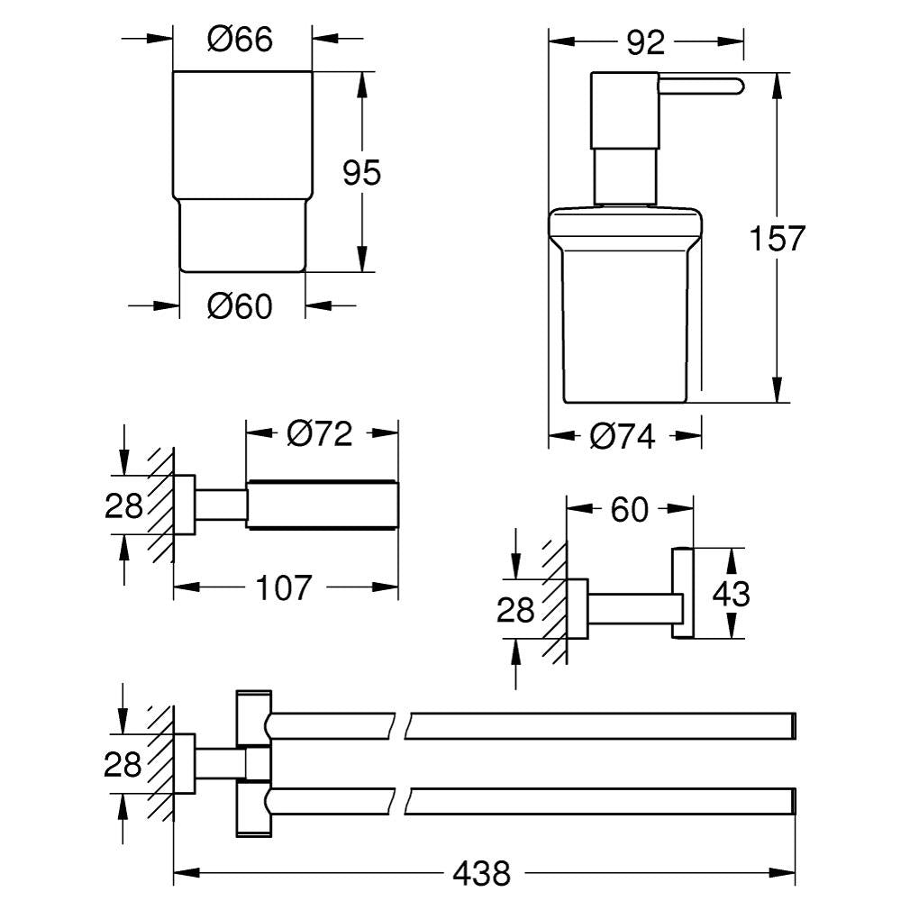 Looking for the perfect finishing touch to your new bathroom The 4-in-1 Grohe Essentials accessory set brings together those essential final elements for a chic, comfortable scheme, including a soap dispenser with holder, crystal glass with holder, double towel bar and robe hook. In dazzling, durable Grohe Star Light chrome finish, this set has everything you need to complement your bathroom, with all matching elements designed to create visual harmony and premium performance.