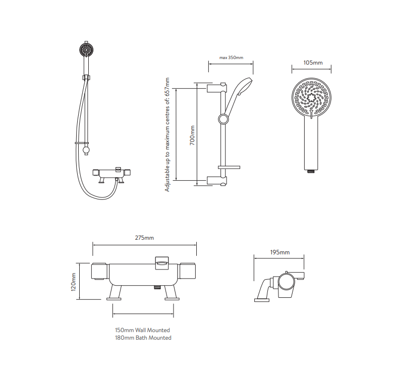 Valve Inlet Centres 150mm wall mounted or 180mm bath mounted. Pipe centres can be adjusted between 130mm - 170mm using eccentric elbows (not supplied with product)