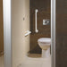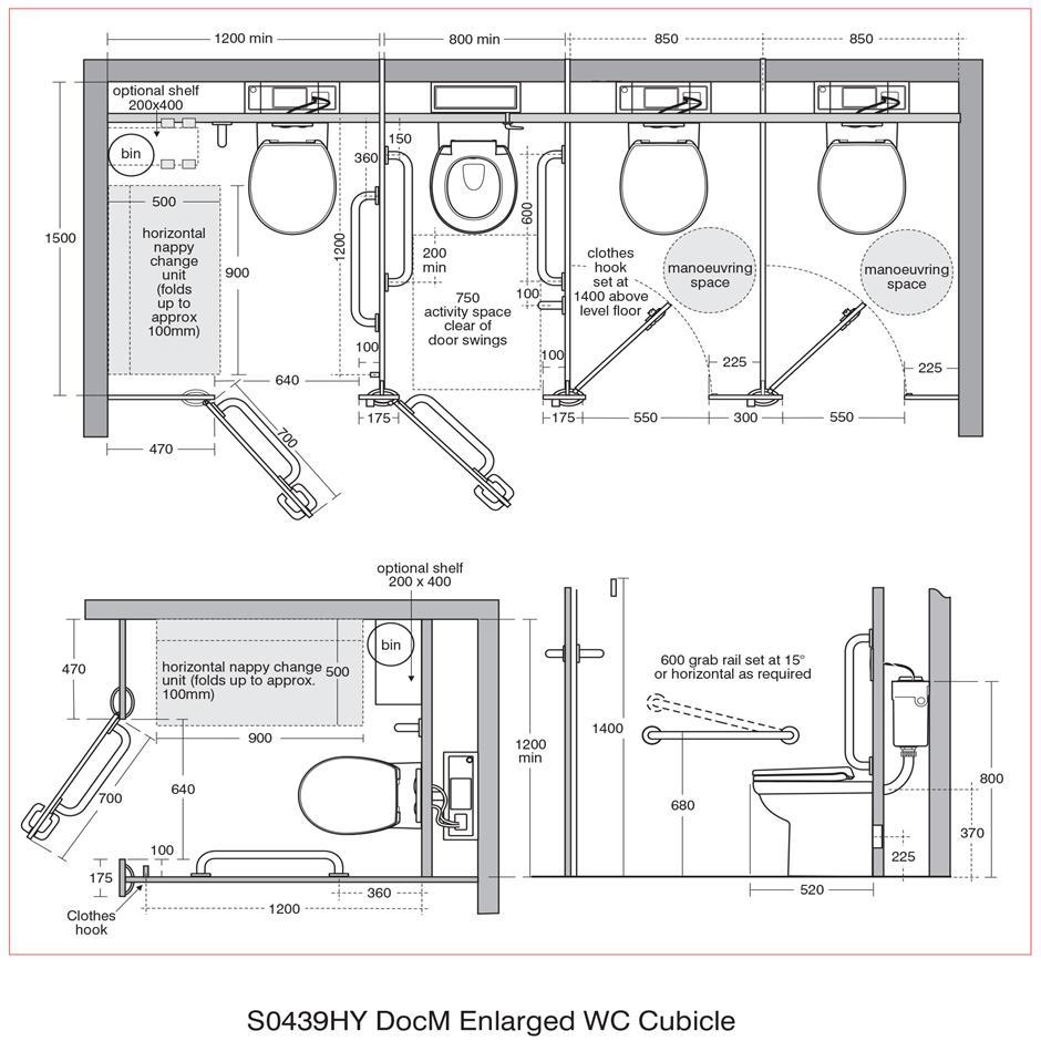 Where four or more cubicles are provided in a washroom one of these must be an enlarged cubicle. This cubicle must be in addition to the ambulant disabled cubicle (see page 18:3:13) and must be a minimum of 1200mm wide. One horizontal and one vertical grab rail must be supplied to set around the WC.There must also be a space for a shelf and folding changing table, an outward opening door and closing/opening bar on the inside of the door. Supplied with layout drawings, detailing the fixing positions necessary for Doc M compliance. 600mm grab rail S6454 x 2 for room set 450mm grab rail S6452 for back of door
