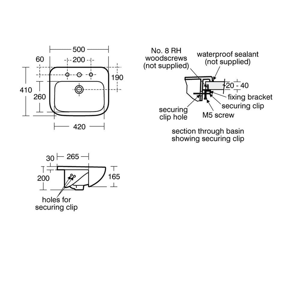 Washbasin fixed to countertop with securing clips provided. Joint sealed with waterproof sealant (not supplied)