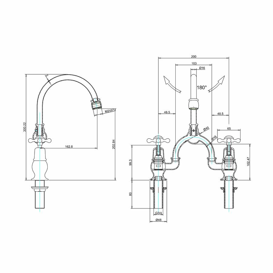- T24-QT: Quarter turn 2 tap hole arch mixer with curved spout (200mm centers)