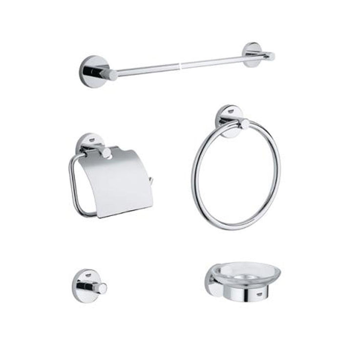 The perfect finishing touch! To create a seamless bathroom design simply add the Grohe Essentials Accessory set. Comprising the towel ring, towel Rail (600mm), robe hook, toilet paper holder (with cover) and a Soap Dish with holder, this superb collection has a timeless look and is crafted to the highest standard. Its sophisticated style is capped off by a gleaming chrome finish that is scratch resistant and very easy to clean.