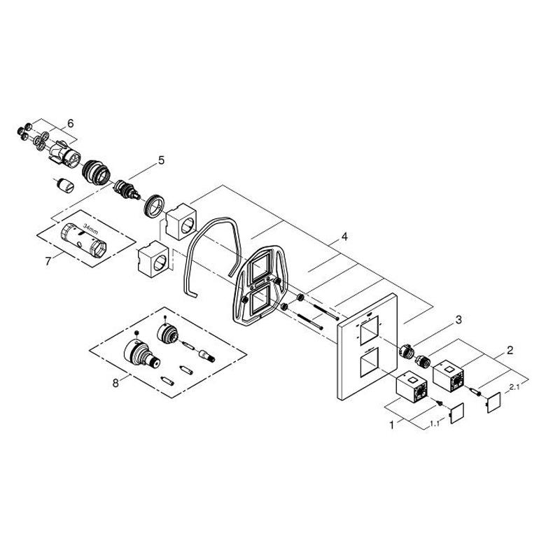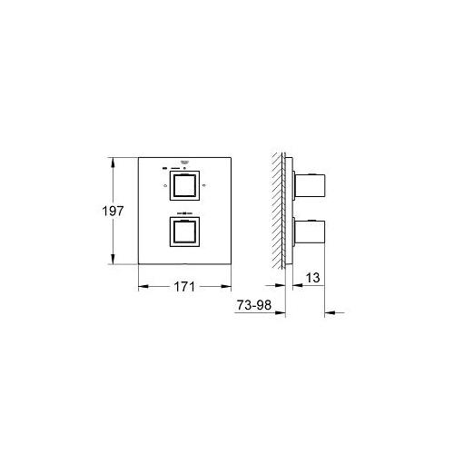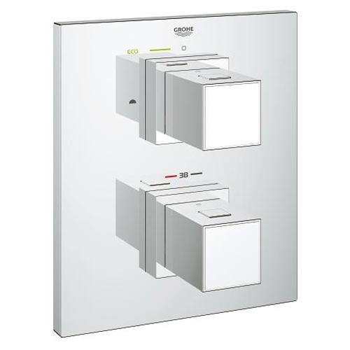 These lustrous controls blend in perfectly with the GROHE Eurocube range. The cubic handles provide excellent control and superb ergonomics, allowing you to adjust water temperature and volume with ease. The GROHE AquaDimmer Eco diverts the water flow smoothly from bath inlet to shower or head to hand shower. The GROHE SafeStop button protects your skin from scalding by preventing accidental temperature increases, while the GROHE EcoButton can be activated to limit the water consumption of the shower. With the GROHE QuickFix system, you will have the fittings installed in the blink of an eye. If you love a sharp, clear-cut design, choose this thermostat to add a fresh appeal to your bathroom. Please note that these wall-mounted fittings must be installed in combination with the GROHE Rapido T concealed thermostat (35500000). Engineered with the GROHE TurboStat technology, it delivers the selected water temperature in a fraction of a second and maintains it reliably.