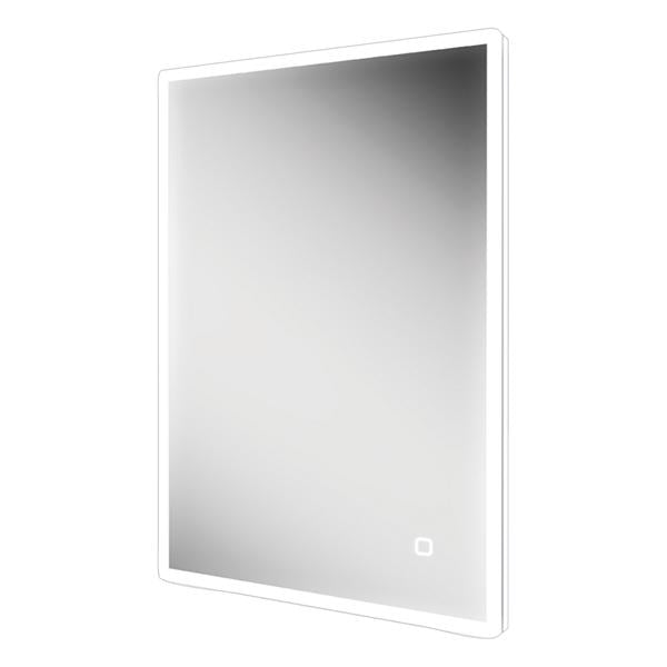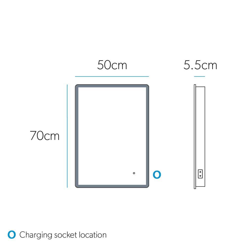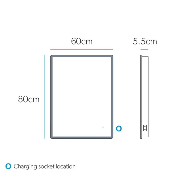 Portrait steam free LED mirror with ambient lighting, charging socket & light adjusting touch switch.