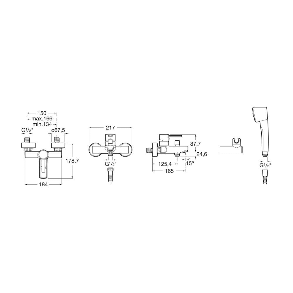 Roca Targa Wall-Mounted Bath-Shower Mixer with Handset, Hose and Bracket
