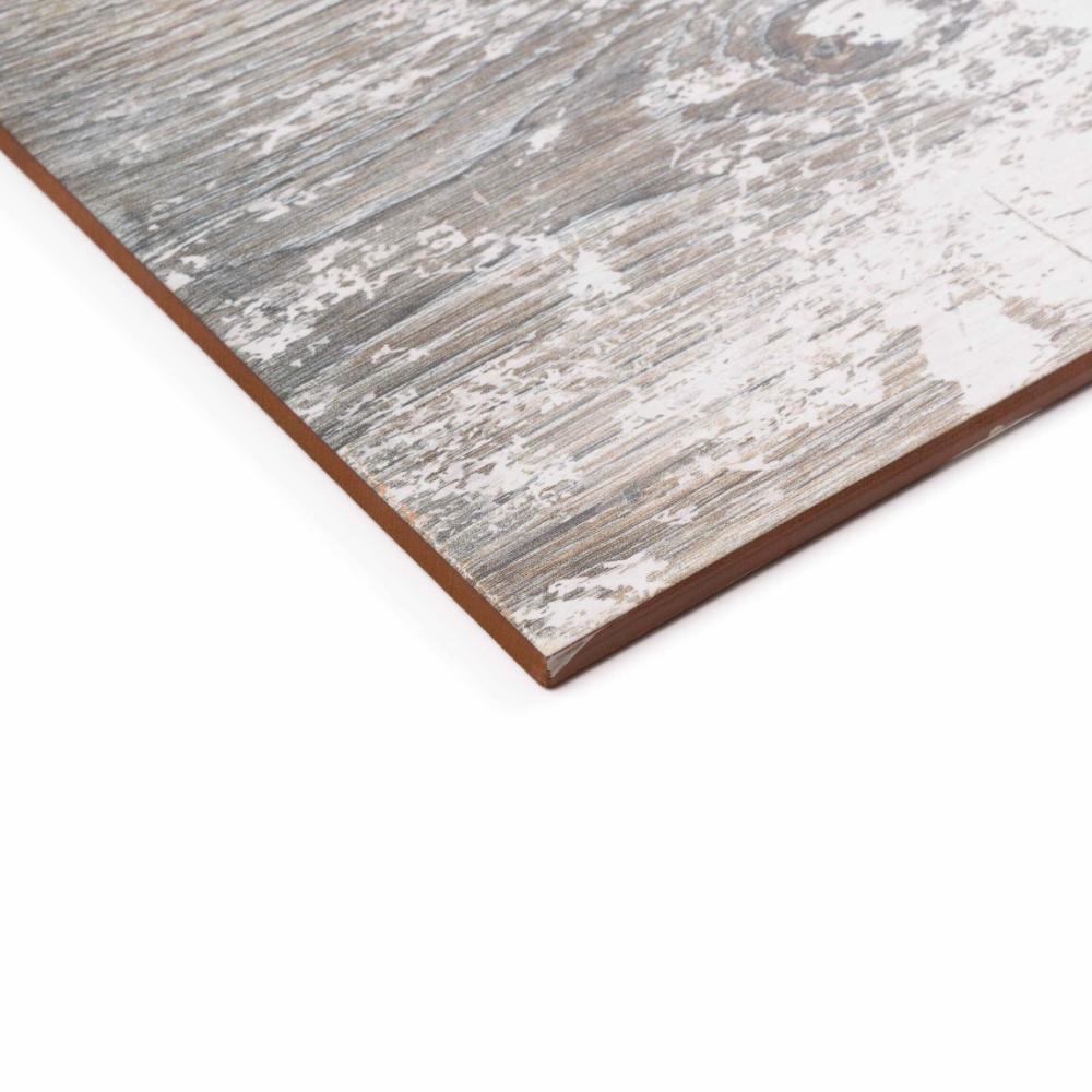 Fresno Gris is a rustic wood effect tile with natural knots and grains across a weathered design in a mix of grey and blue tones. Made from ceramic with a matt finish, it features a 570x190mm format, 8.5mm thickness, 12 face variations, and a PTV36+/R12 slip resistance rating, making it suitable for all interior floors and walls.