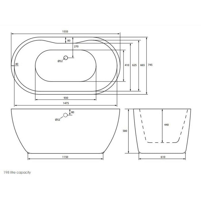 - Size: 1555 x 750 x 580mm. 198 litre capacity - White