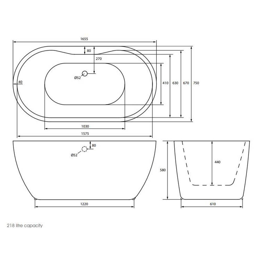 - No tap holes, suitable for floor standing, wall mounted taps or drill for two tap holes.