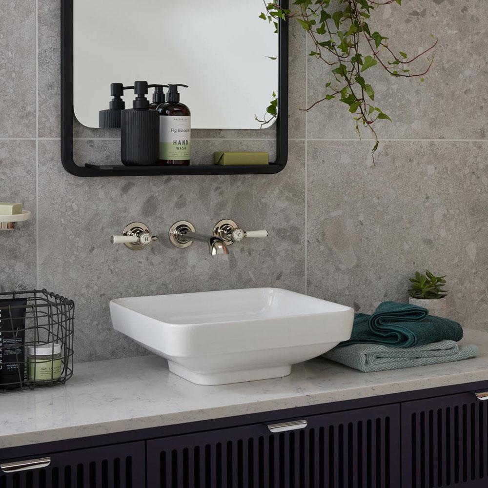 The Axbridge Booth & Co collection is available in bright nickel and chrome, each featuring unique ceramic accents with a choice of cross and level handles.